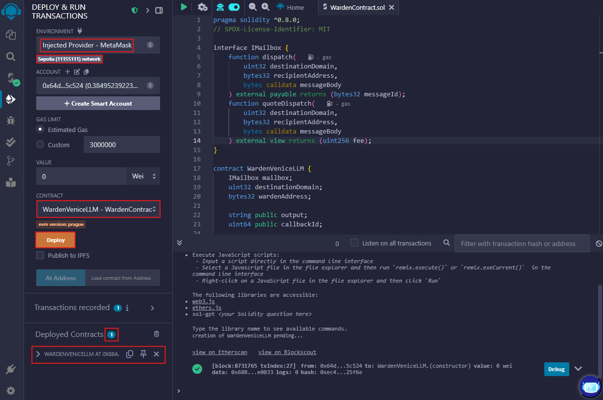 This step-by-step guide walks you through deploying your first Warden-enabled Solidity contract on Ethereum Sepolia. You’ll use Remix to deploy the contract; then you’ll send a request to Venice AI and receive the response, which will be stored onchain.
