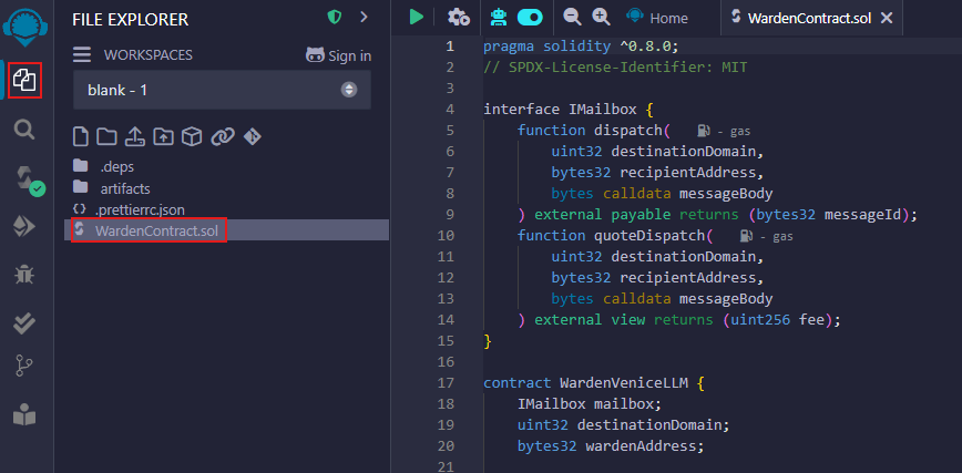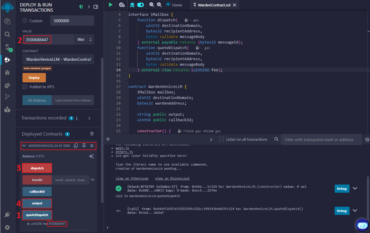 quoteDispatch()anddispatch()functions. This allows you to set the parameters directly from Remix after deployment, using the quoteDispatch and dispatch buttons. Here's an example of how to implement a dynamic prompt:function dispatch(string calldata prompt) external payable returns (bytes32 messageId) { <...> } function quoteDispatch(string calldata prompt) external view returns (uint256 fee) { <...> }Finally, explore other Plugins! They work the same way – you can call them using the same functions. The only difference is the structure of the input. For input details and code examples, check out the available Plugins in Warden Studio.