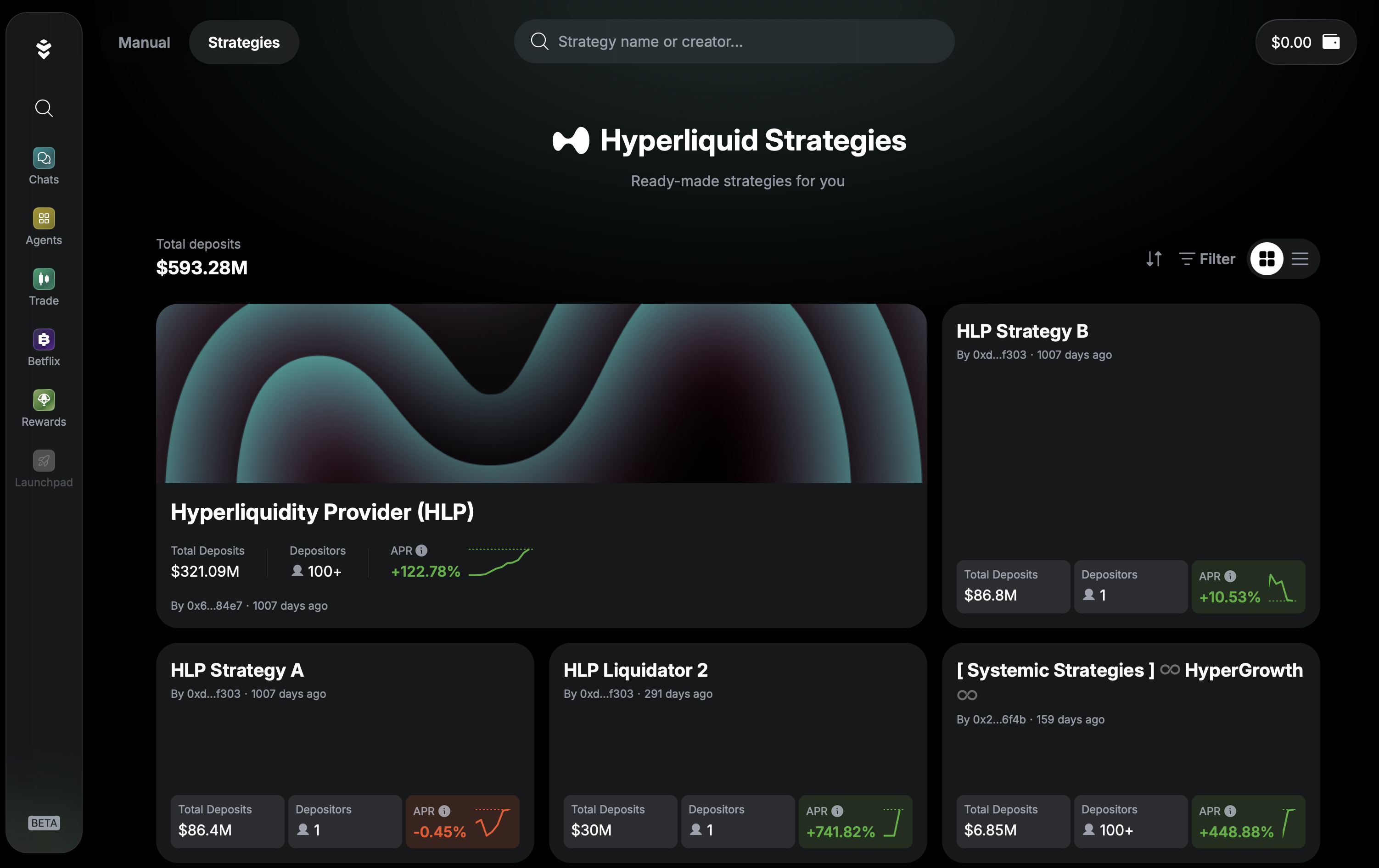 We're kicking off with Hyperliquid Strategies, giving you access to one of the most performant DEXes in the ecosystem. These Strategies tap into Hyperliquid's deep liquidity and low-latency execution to generate yield through proven trading approaches.