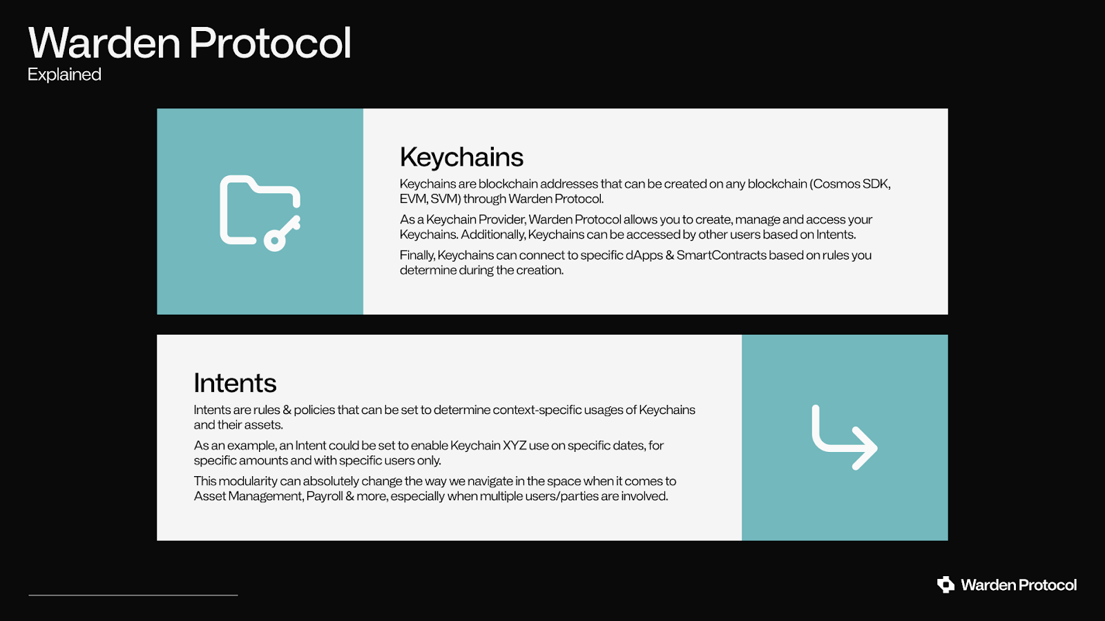 Warden Protocol is an intent-centric protocol, built on the Cosmos SDK, that enables various execution layers for interoperability, modular key management and account aggregation.