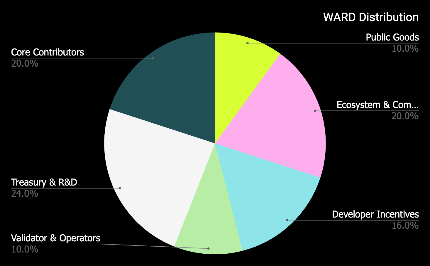 The WARD token distribution will adopt a fair launch mechanism. This approach ensures a wide and equitable distribution of tokens, preventing market manipulation and ensuring a rapid distribution of stakeholders and community governance as the majority of the supply will be unlocked day 1 to reduce the delta between MC & FDV.
