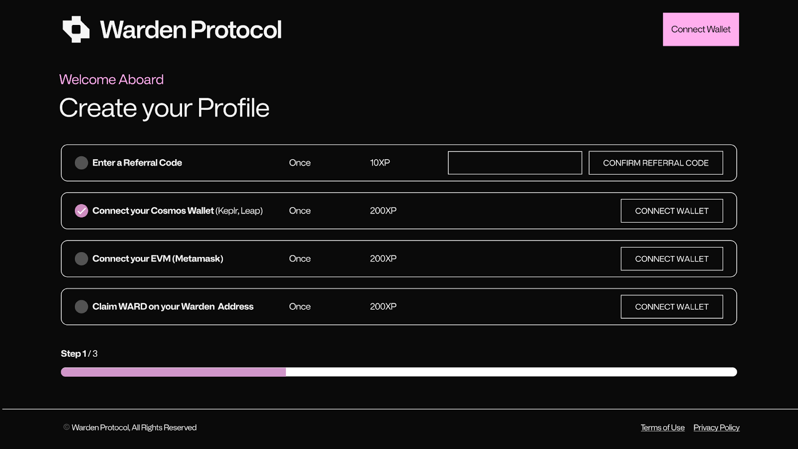 At the beginning of the onboarding, you will create a user profile that will be a combination of your social accounts (X, Telegram, Discord) and your onchain addresses. Then, you will be able to redeem points by joining our Telegram, Discord and Interacting with Warden Protocol X posts. Ultimately, posting $WARD on X as well as engaging posts with the @wardenprotocol tag will be rewarded (the more engagement you get, the more points you earn).